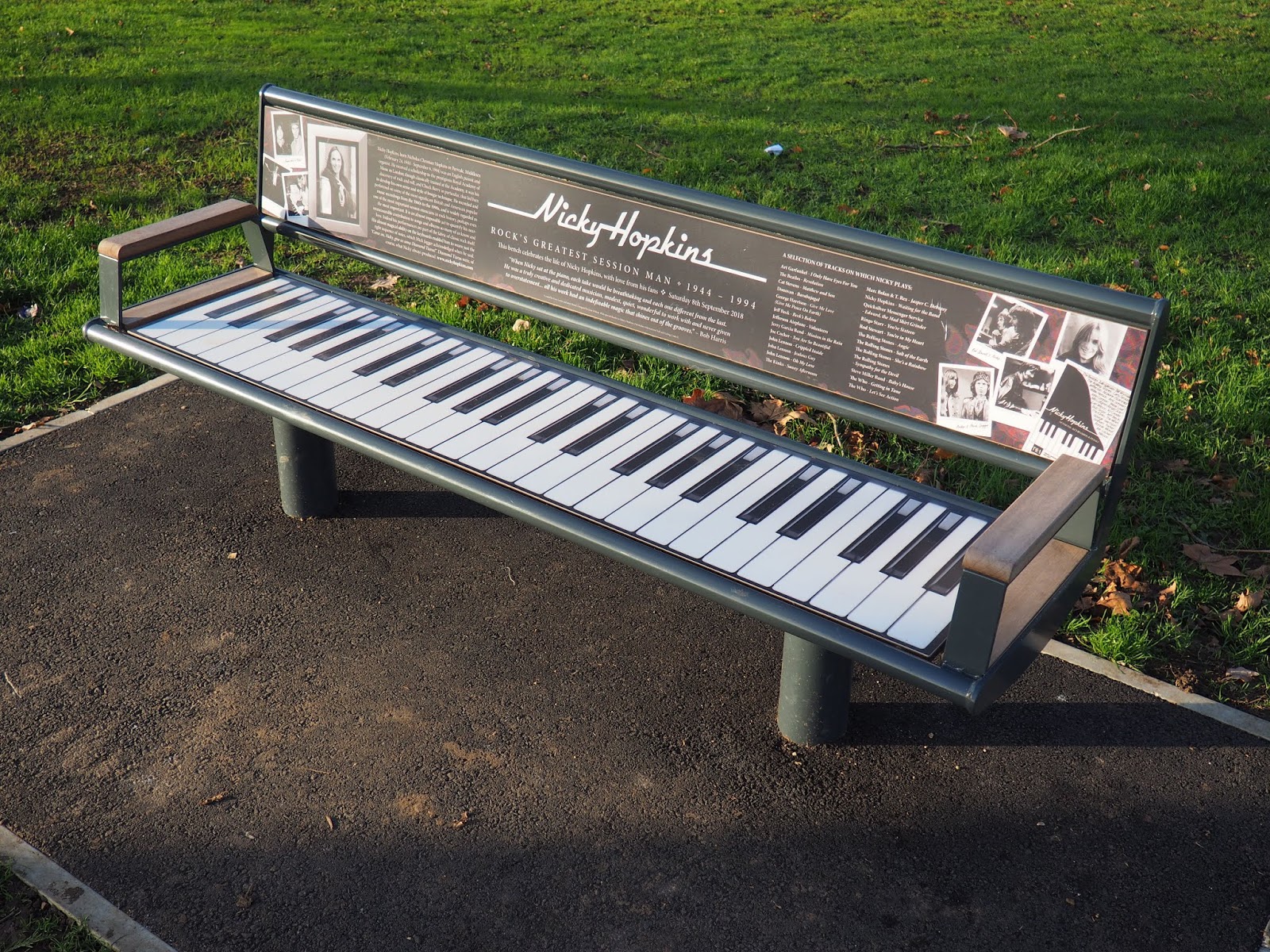 But has there ever been a better musical tribute than this one? The Nicky Hopkins memorial bench, seen while walking in Perivale.