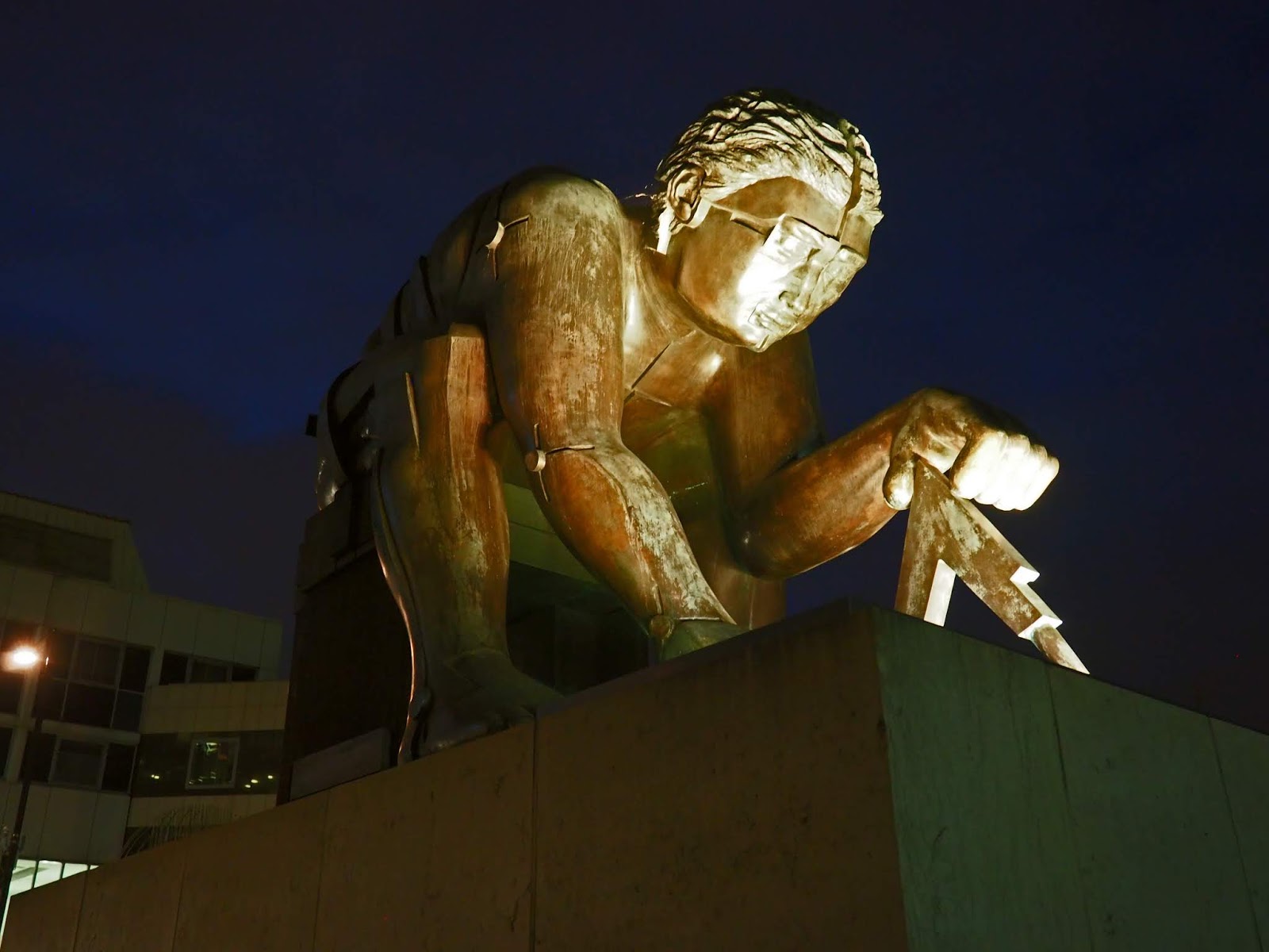 This being the winter, it’s generally dark when I leave the British Library, and as I walk out I look up at Eduardo Paolozzi’s statue, widely known as “Newton After Blake” which looms over me, without quite making eye contact.