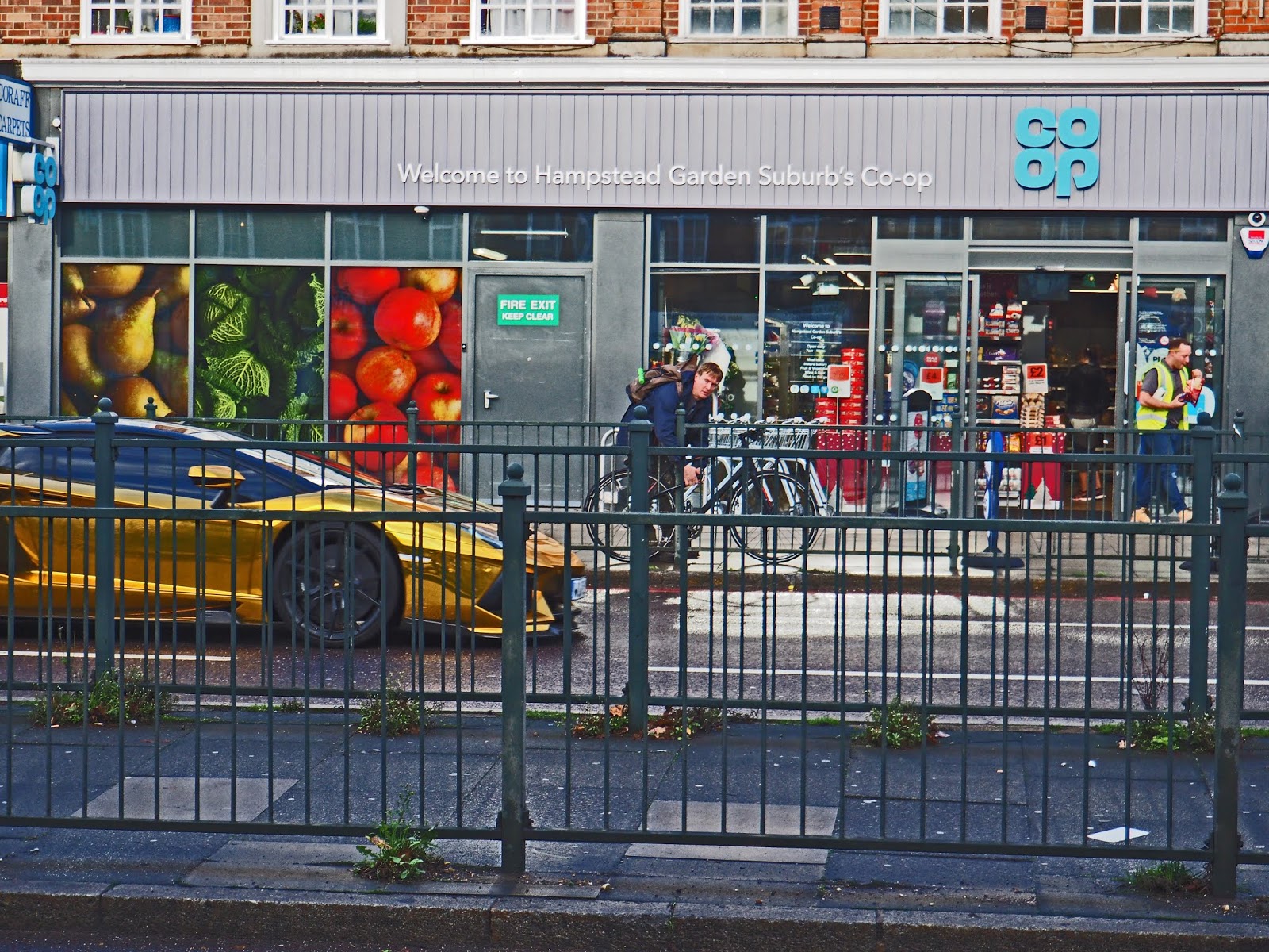 The Suburb was built with no pubs, no shops no cafes, no cinemas – a situation that endures - though the supermarket in Finchley Road has a sign on the front that reads, “Welcome to Hampstead Garden Suburb’s Co-op.” You will note the very shiny car coming in from the left.