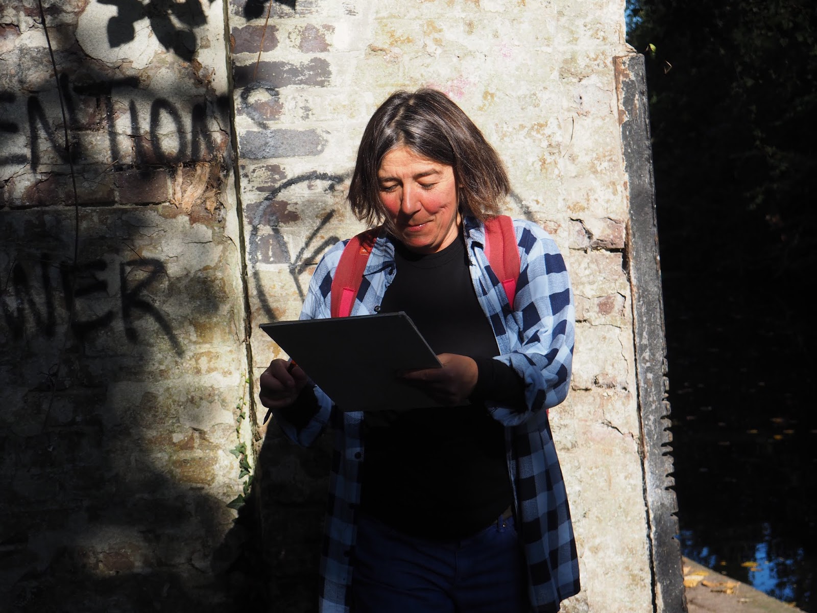 Last Sunday I walked from Uxbridge to Manor Park, Tube station to Tube station, most of it along the London Loop, much of it along the Grand Union Canal. That’s not my usual kind of walking territory, which was an attraction in itself, and another attraction was that I was walking with Foster Spragge who is sometimes described as a walking artist, and at the very least is an artist who sometimes uses walking as part of her “practice.” This is her: