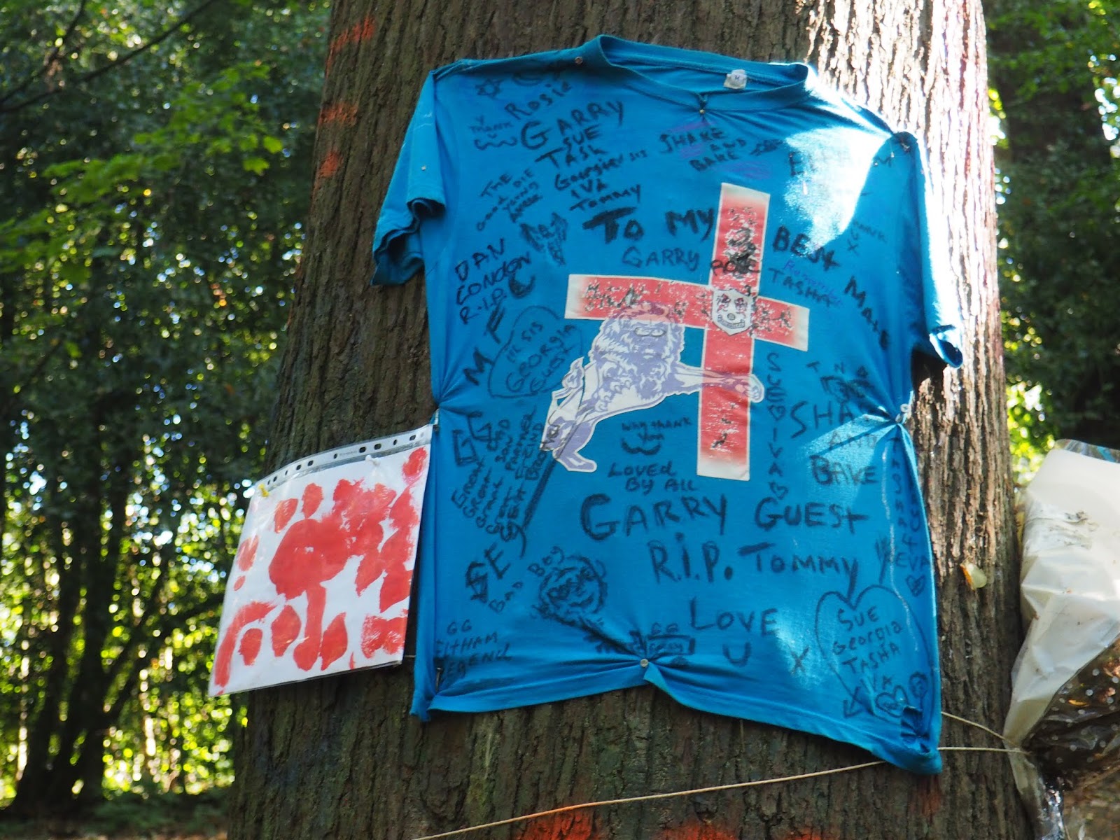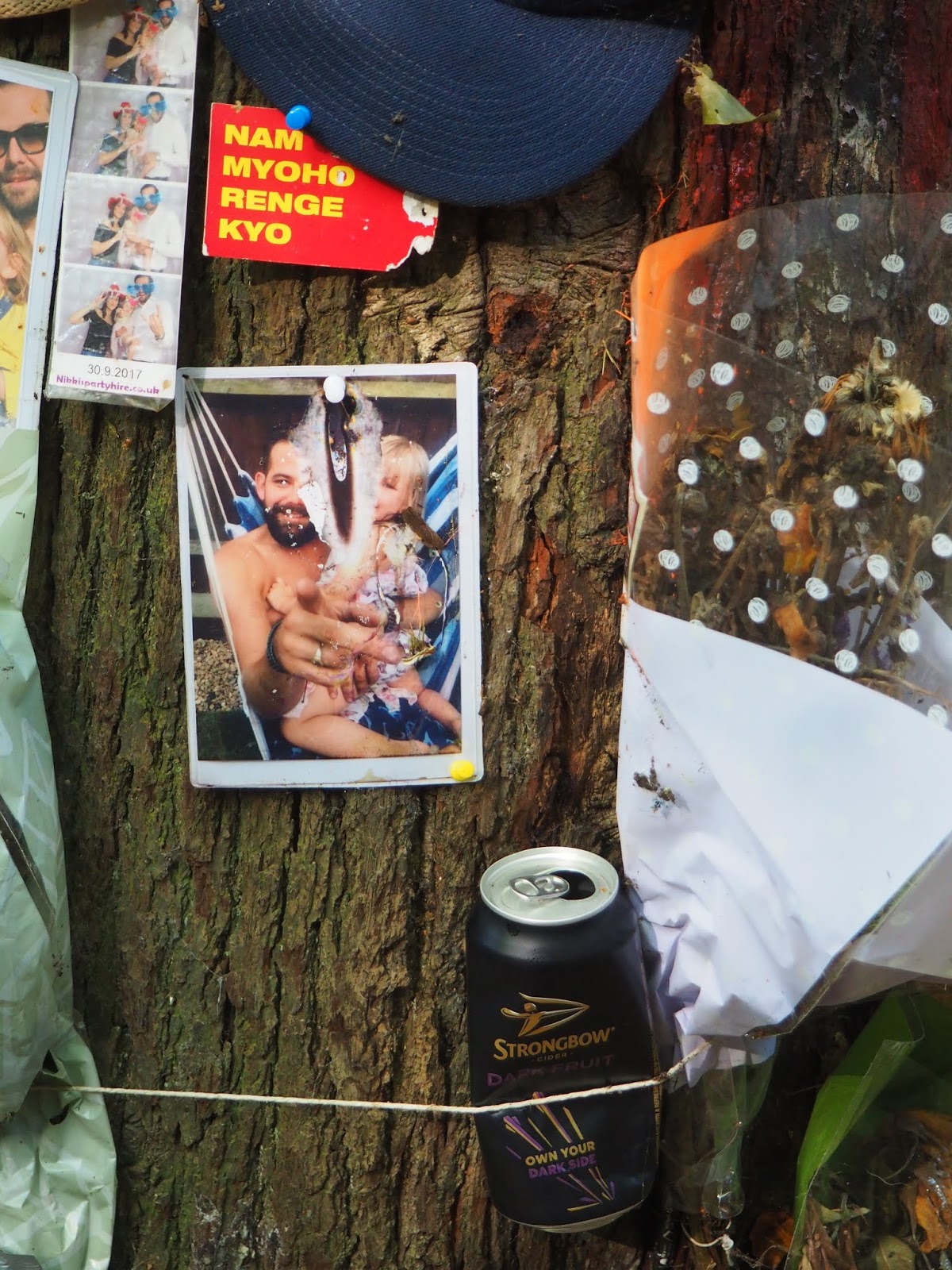 The lower part of the tree has now been turned into a rough, makeshift memorial that is gradually being worn away by the elements. It’s strangely moving in its roughness and decay, not least the photograph and the empty Strongbow can.