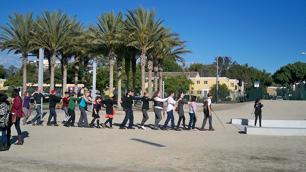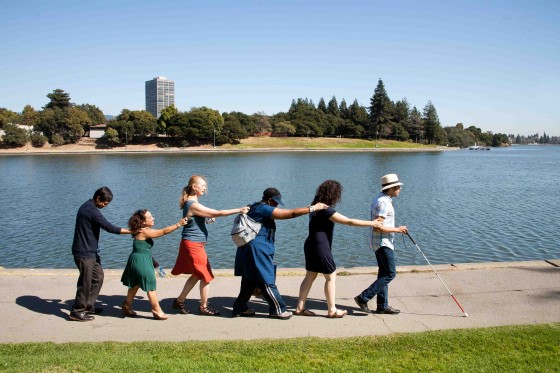 I was then reminded of “Blind Field Shuttle” a performance work by the artist Carmen Papalia, who is blind, and who leads people on walks as they follow behind him, hands on the shoulder of the walker in front, their eyes held shut. I’d have thought blindfolds would have make the work better, but probably there are health and safety issues. The event, which obviously changes all the time, sometimes looks like this: