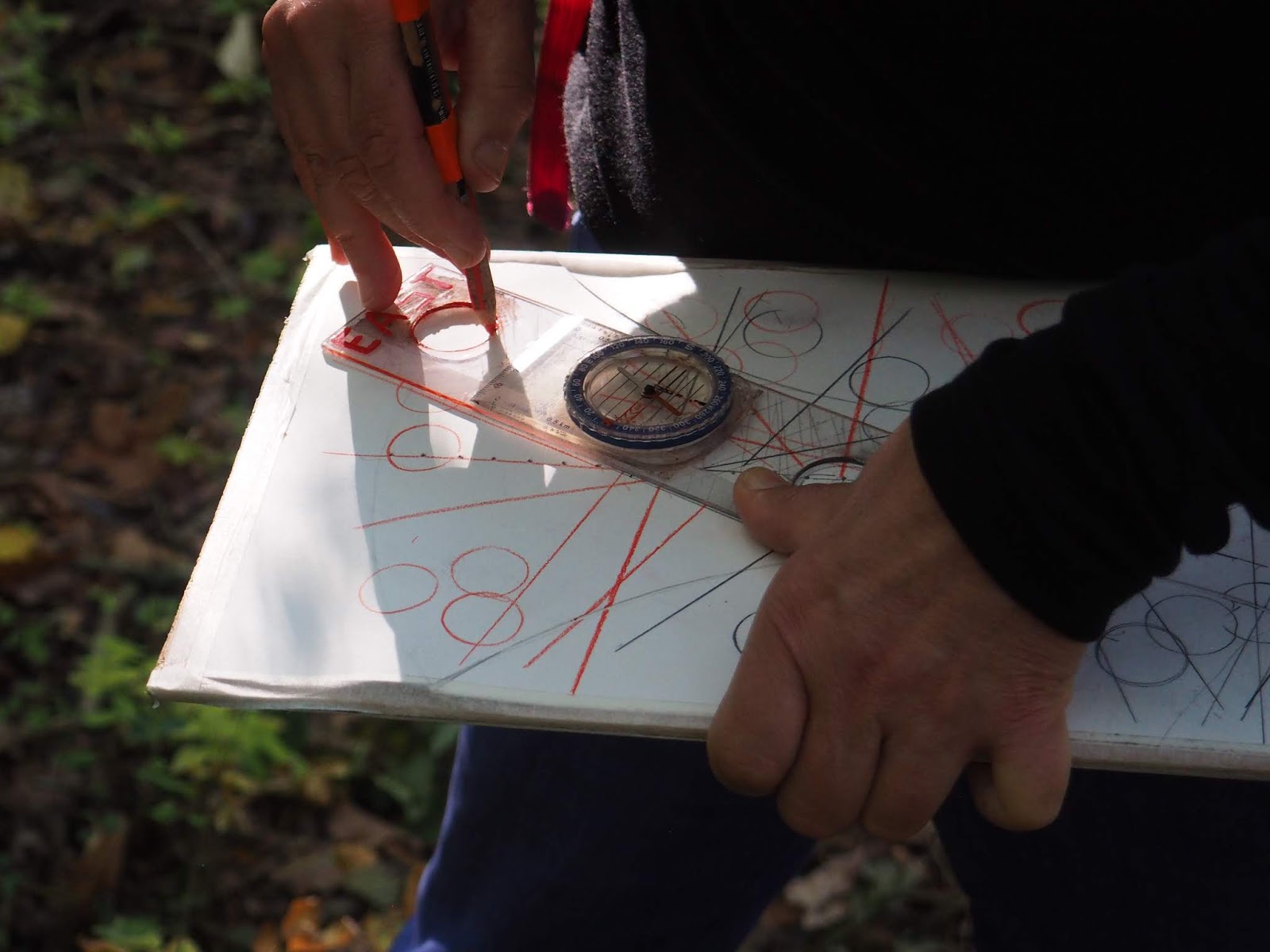 On the board was a sheet of paper, marked up with a line of marks or holes. Every 7 minutes as we walked she used a compass embedded in a clear plastic ruler with 2 circular holes, and centered it on the spot marked by a hole, drew a line marking the north/south axis, and a couple of circles. I think I’ve got that right but I do stand to be corrected. This created gorgeously inscrutable images that will, I believe, ultimately be used to inspire a different work of art.