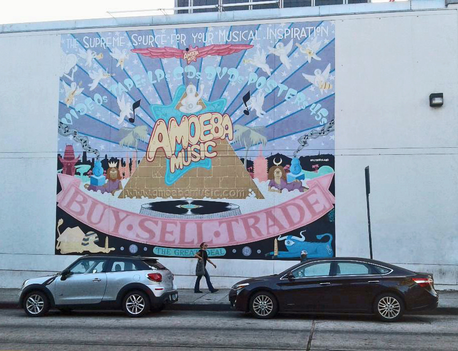 And then last night I was walking past Amoeba Music, a shop that’s been in business in LA about as long as I have, with the consequence that the mural on the side that runs down Ivar Avenue, is looking a little faded these days.