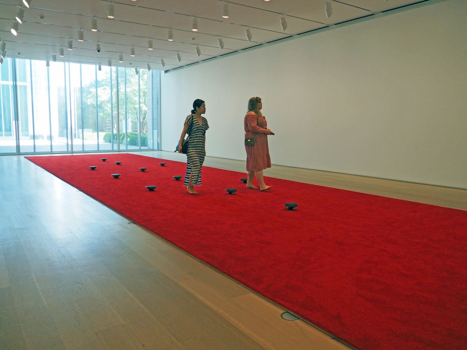 It involves a long broad stretch of carpet with loudspeakers embedded in it, and you experienced the work by taking your shoes off and walking among the speakers each of which is broadcasting a prayer from a different faiths. As you walk you can stop and concentrate on one message or listen simultaneously to two or to many of them in a cacophony.