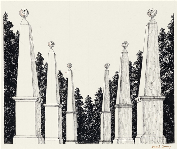 Then I found this image by Edward Gorey (he was quite a man for an obelisk) – and as I’ve said before, everything’s better with skulls, even obelisks.