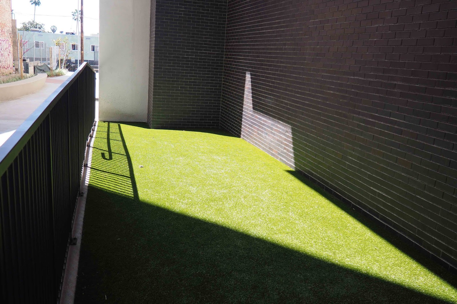 Not very far away, in a corner of a newly built apartment block, I did find this patch of green. It’s a (very, very small) dog park. The “grass” is Astroturf.