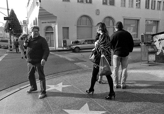 Neither the book nor the review discusses walking per se, but as a street photographer, Winogrand obviously did a lot of walking, as I suppose all street photographers must. We tend to thing of his “beat” as being in Manhattan but he traveled widely and spent time in LA. Here he is on Hollywood Boulevard; the photograph is by Ted Pushinsky.
