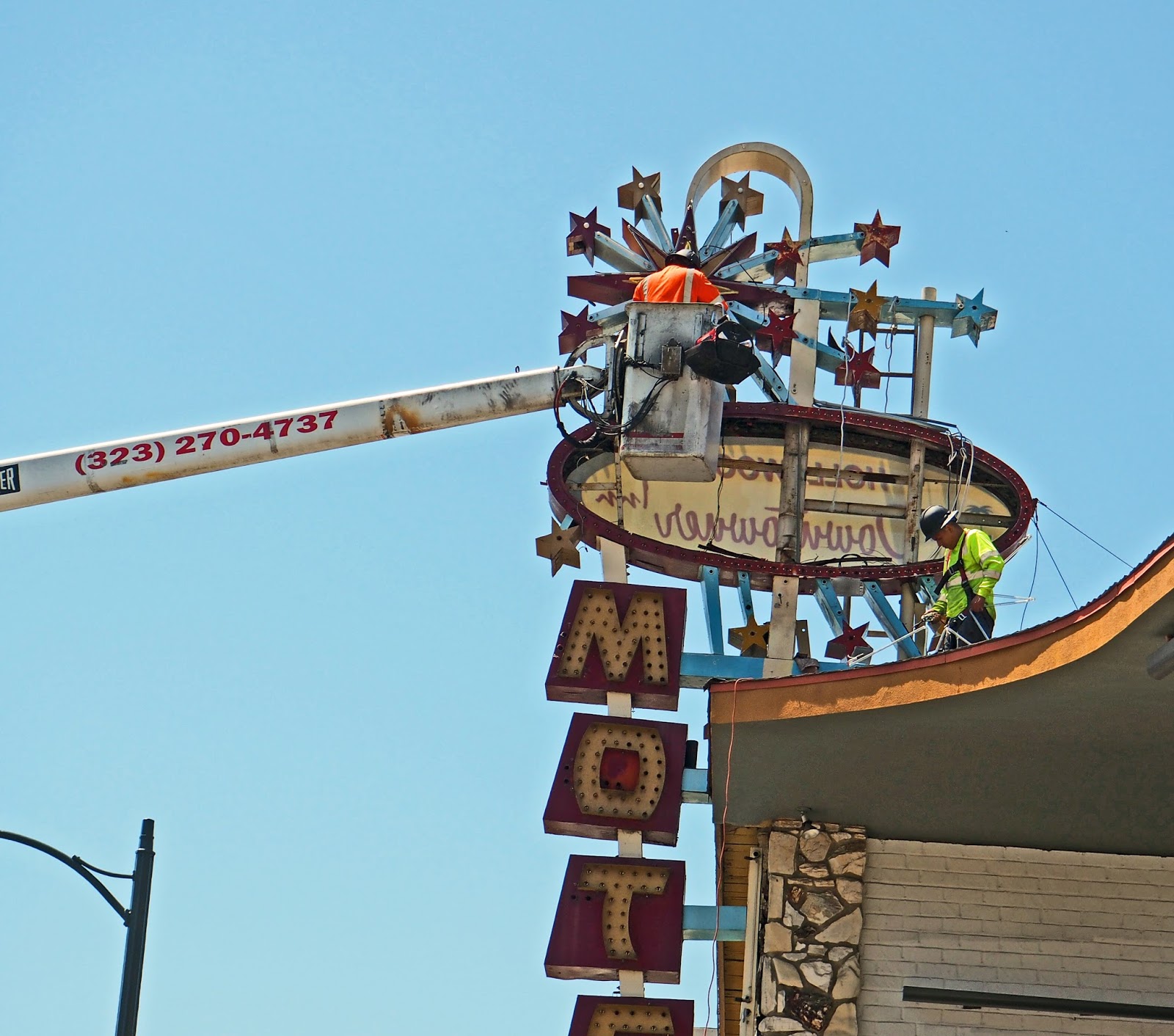 The Hollywood Dowtowner, a place I’ve photographed a few times in passing over the years, is certainly my favorite from the outside, and I was quite cheered to see these guys below working on the neon sign.