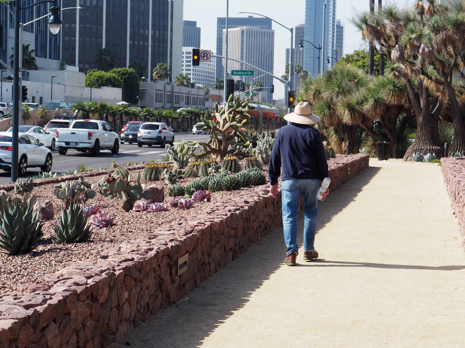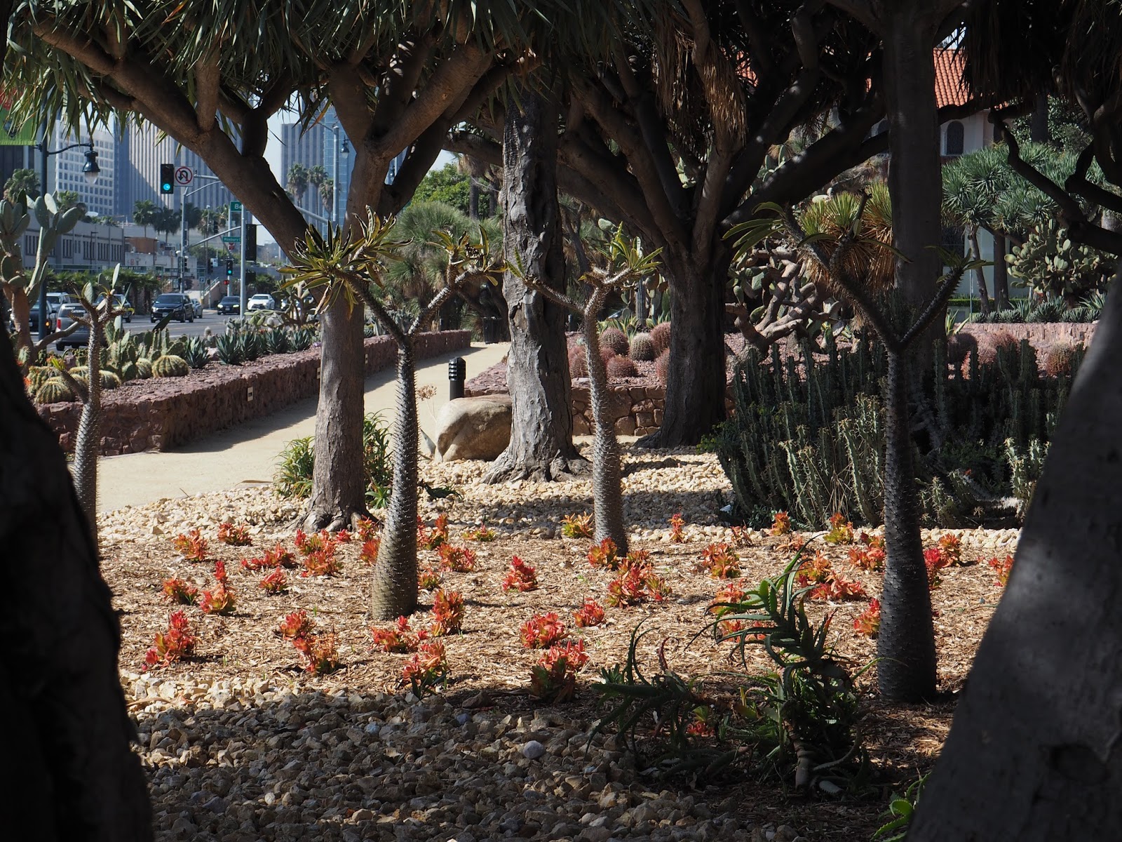 BeforeThe real joy of the Beverly Hills Cactus Garden, refurbished or not, is that it’s a chunk of desert that sits right there alongside Santa Monica Boulevard – the old Route 66 – you walk among the opuntia and the pachypodia as the traffic flies by.