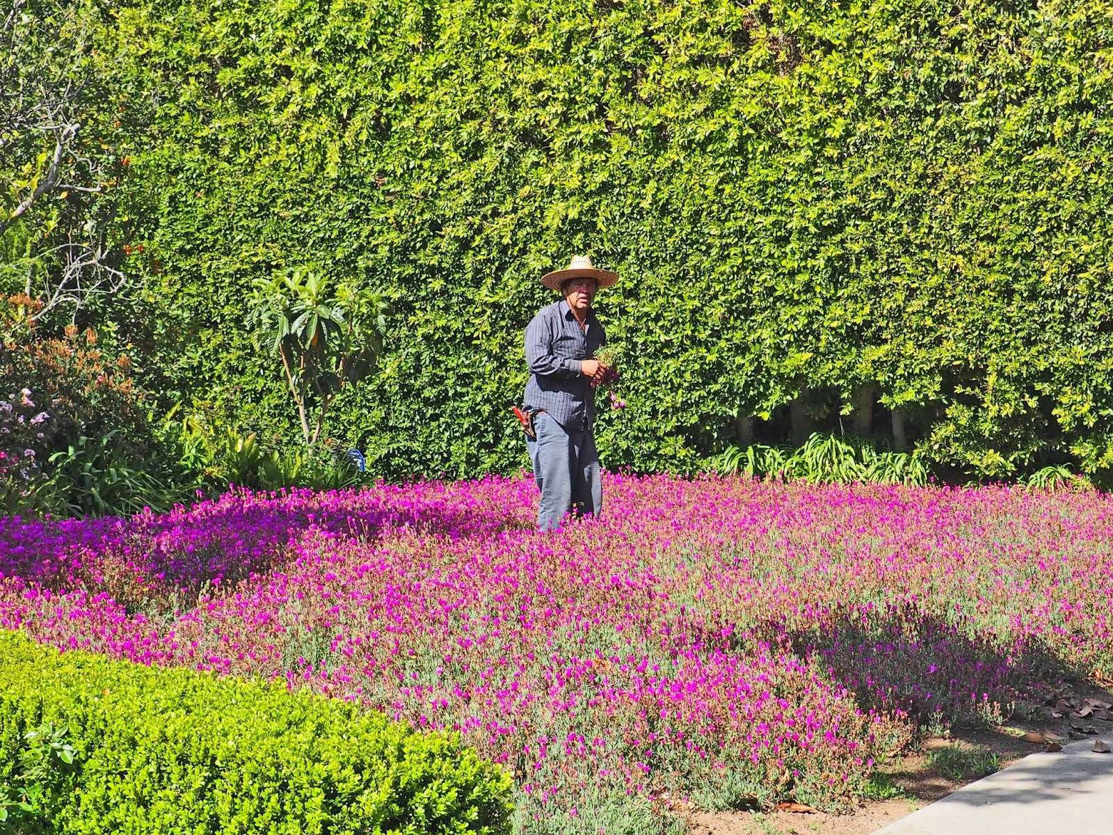 And so being in need of a bit more of a walk I took a stroll around the neighborhood. I always say that I'm surprised they even let me in to Beverly Hills. And I saw a house with a fabulous patch of color in front of it, with a gardener standing in the middle of what turned out to be a sea of flowering ice plants.