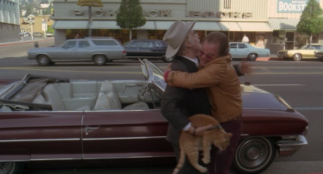 And so the other night I watched Harry and Tonto, a pretty good, if very much of its time (1974), movie about an old geezer (Art Carney who is actually playing a character much older than himself) who goes on a road trip with his cat Tonto, who indeed has a collar and a leash. They end up on Hollywood Boulevard opposite Pickwick Books and yes, that is Larry Hagman: