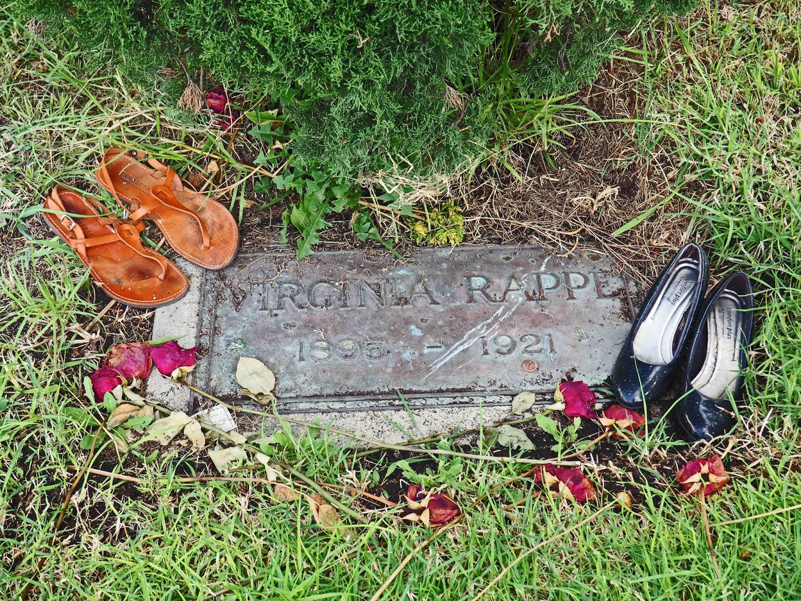 And for headliners, there’s the Garden of Legends, that’s where Johnny Ramone is, and fame being the fleeting thing it is, some of the people buried there are now very obscure, so even having been a legend doesn’t necessarily mean a big memorial. Here for example is the headstone of Virginia Rappe, complete with tribute footwear: