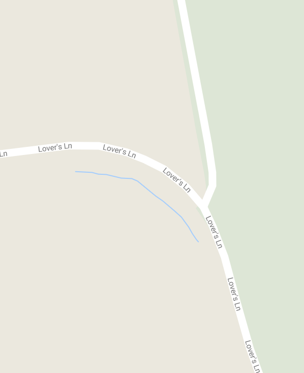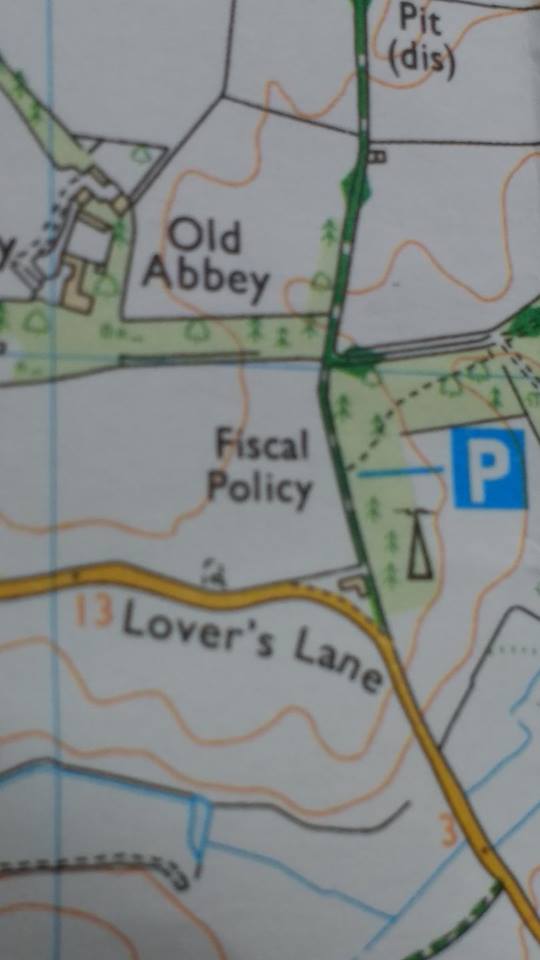 Since it’s not a street, there’s some speculation that it might be an Argleton – the name given to phantom settlements that appear on Google maps. However, although a look at Google maps and Google satellite images locates Lover’s Lane, and the other features, thereby confirming that this is the right place, there’s no sign of Fiscal Policy. Go pick the cartographical gristle out of that one.