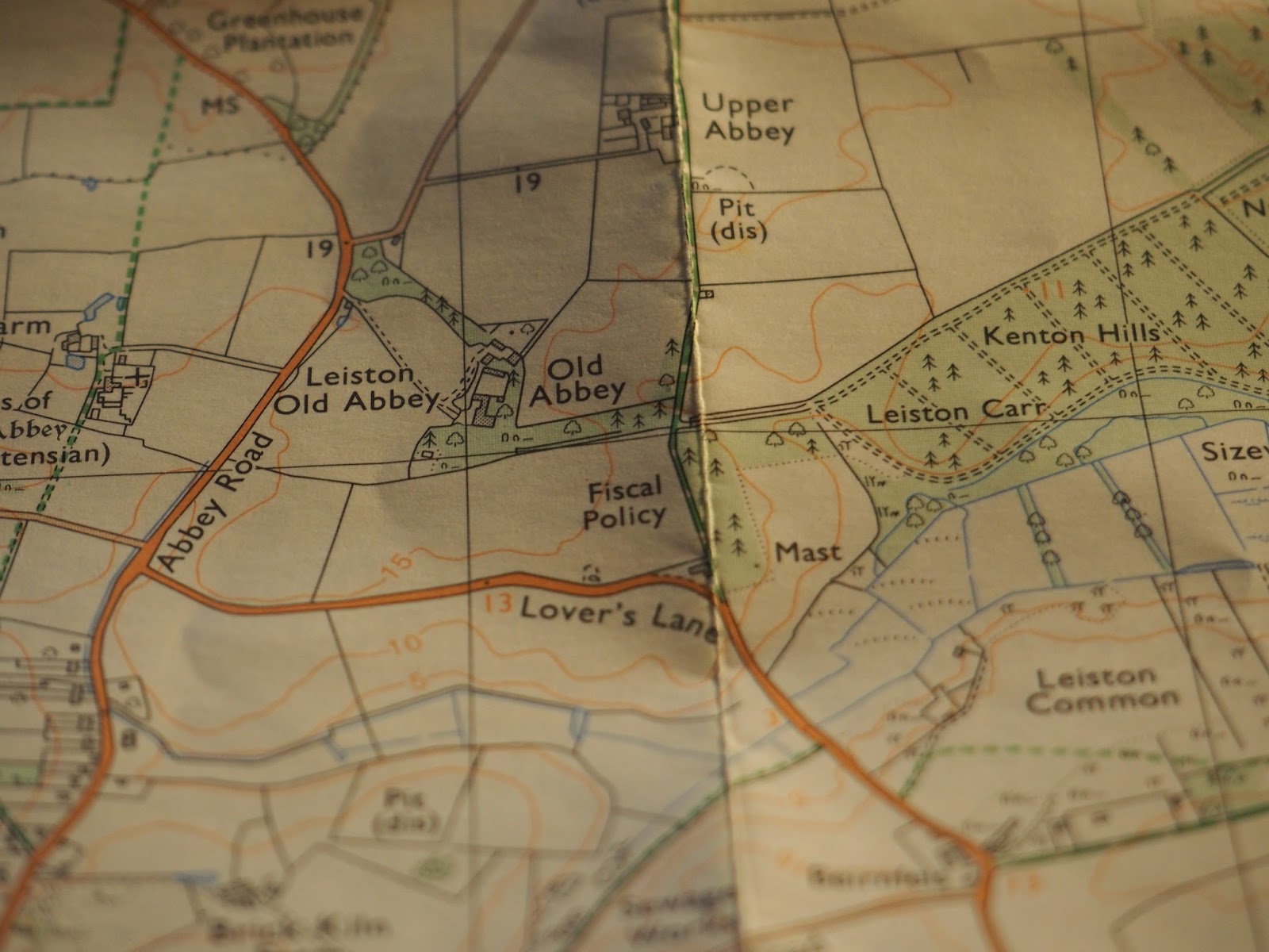 Now, life being as it is, I used to live fairly close to Leiston, walked there from time to time, and I still own a copy of O.S. Pathfinder 987 Leiston, and a good look at the map reveals this same Fiscal Policy, right on the fold. The map is copyright 1983, and there’s no indication that it’s been updated.