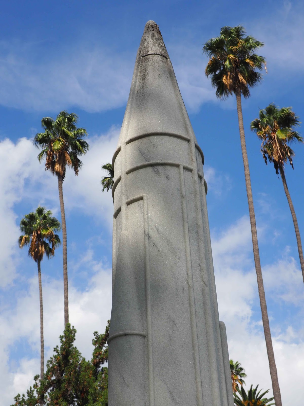 The thing that everybody notices at Hollywood Forever is the one in the shape of an Atlas rocket, the memorial for Carl Morgan Bigsby. It might lead you to think he had something to do with the space program, but apparently not. The monument says Bigsby was “a recognized leader in many phases of the graphic arts,” a pioneer, just like the Atlas rocket, suggesting that we’re dealing with a metaphor here. Trying to track him down online reveals that he’s most famous for having this very large memorial.