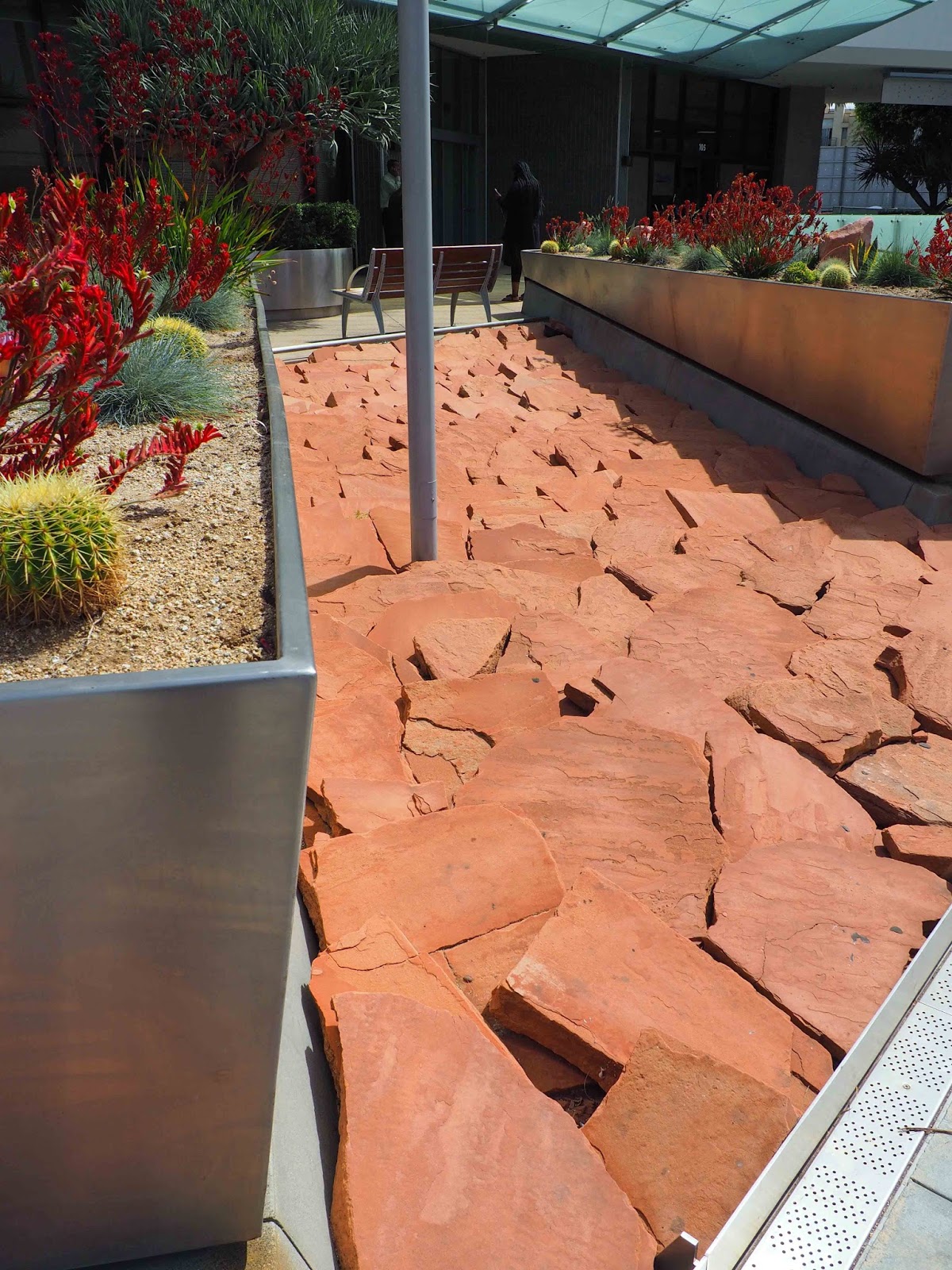 Of course It’s in the nature of art that it changes the way you see the world, so when you’ve got Richard Long in your head and you find yourself, as I did the other day, walking in Los Angeles along Wilshire Boulevard, past a building that houses a Wells Fargo Bank and a slightly distant outpost of Cedars Sinai hospital, I was amazed to find this sea of rough but carefully arranged slabs of red rock.