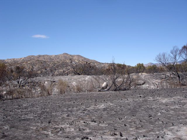 2006 was an “interesting” year to visit. In June 2005 there had been a serious fire that started in a house in the unincorporated community of Morongo Valley. It’s known as the Paradise Fire because the house was in Paradise Avenue; the fire destroyed half a dozen homes and 6,000 acres of the Preserve.At its worst it looked like this (photo from Friends of Morongo):
