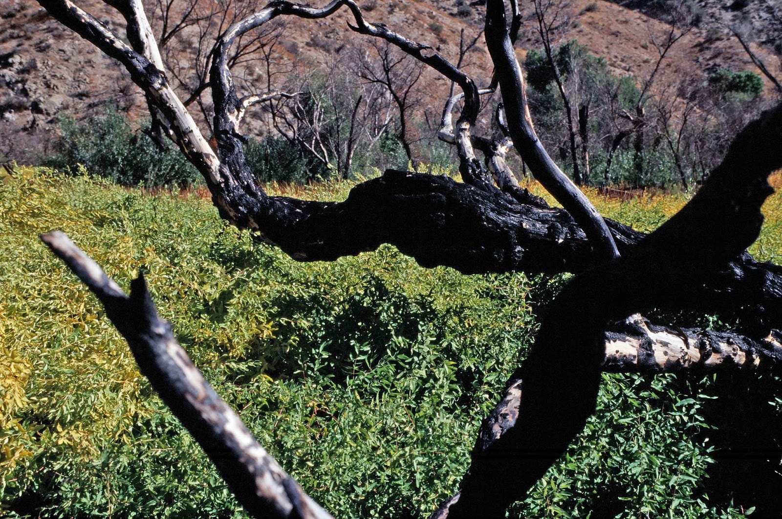 Big Morongo Canyon Preserve is one of those places where they let nature take its course, as far as they can, and so the old burned trees are still there today, sometimes with exuberant new growth all around them, and the effect is even more startling than it was over ten years ago; like this Giacometti-style burned tree: