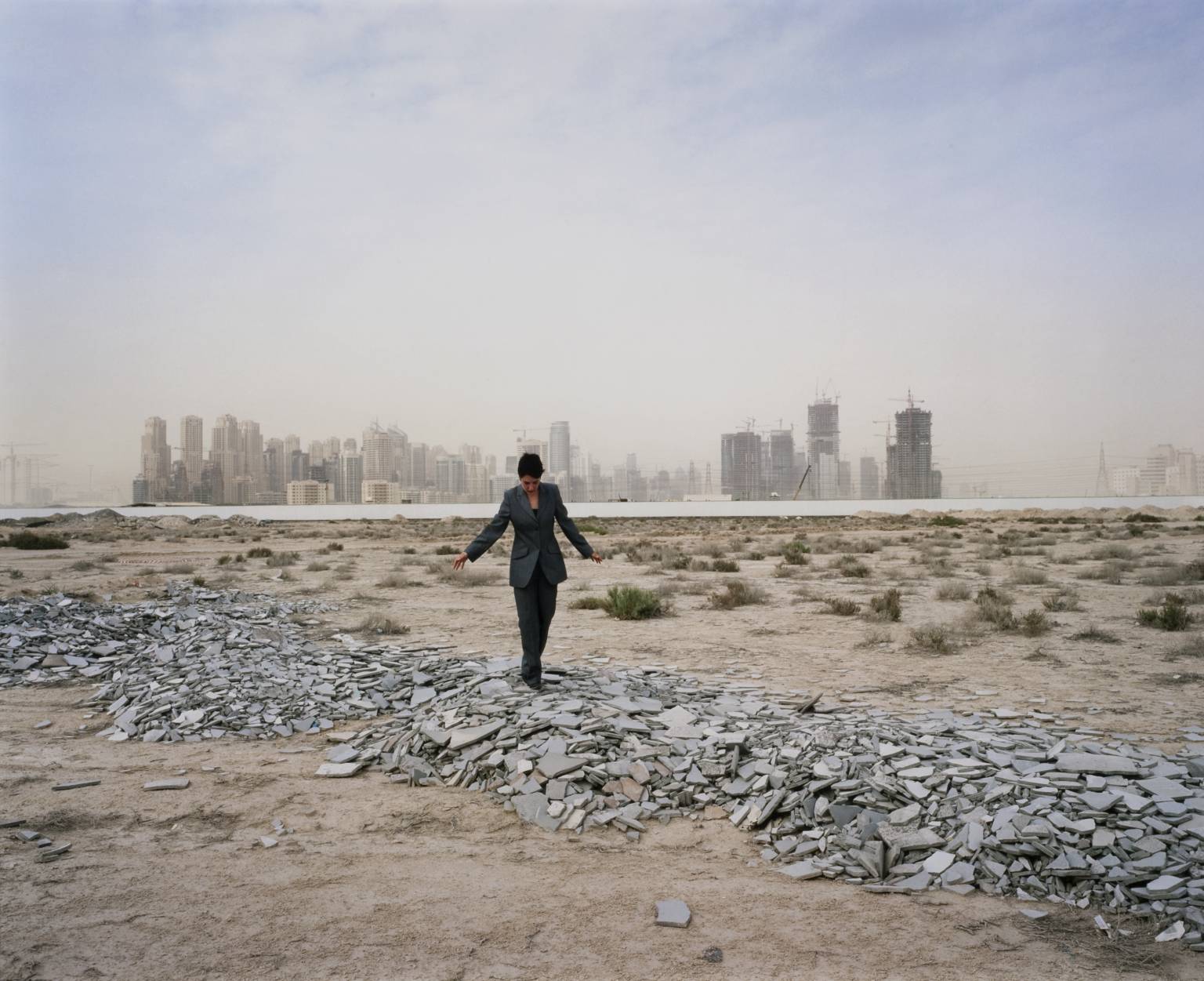 Would you like to hear what it says on Young’s website about her piece? Well of course you would. “Body Techniques (2007) is a series of eight photographs that considers the interrelationships between art and globalized commerce. The title of the series refers to a phrase originally coined by Marcel Mauss and developed by Pierre Bourdieu as habitus, which describes how an operational context or behavior can be affected by institutions or ideologies.” It’s a striking photograph - she’s in the United Arab Emirates apparently – and I always approve of wearing a suit in the desert, and it’s not hard to “get” the work - Long’s Irish rocks are “natural” while the path Young’s navigating consists of “manmade” discarded concrete. But you know, where’s the effort, where’s the walking?