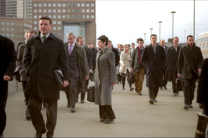 Again her website describes it in ways I couldn’t possibly manage. “The viewer sees Carey Young, dressed in a suit, walking backwards and forwards in a crowd of commuters. … This action is repeated this (sic) until we realize that her repeated walking appears, in fact, to be ‘inscribing’ a line in the crowd. The artist appears to be restaging works by the Situationists as much as Richard Long, particularly his ‘A Line Made by Walking’ much as her activity can also be read as that of a the clockwork toy or caged animal pacing in captivity. She appears as if displaced, or within a different temporal continuum: the artist appears to be repeating the workers’ daily journey but at a faster speed. Her struggles to create a space within the crowd could be seen as a deadpan parallel for artistic ‘struggle’. The artwork appears balanced between two states, as confined as the daily monotony of the commuters’ journey and as some kind of free act hidden within monotony, but equally within its own modes of institutionalization.”