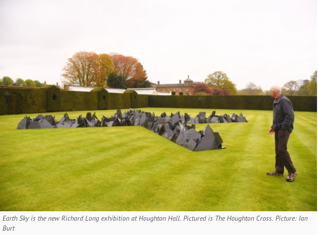 Long’s work also sometimes involves transporting pieces of rock or slate from natural settings or quarries, and then arranging them in art galleries or in outdoor sculpture parks. An exhibition of these kind of sculptures titled Land and Sky: Richard Long at Houghton just opened at Houghton Hall, near Fakenham, in Norfolk, England.