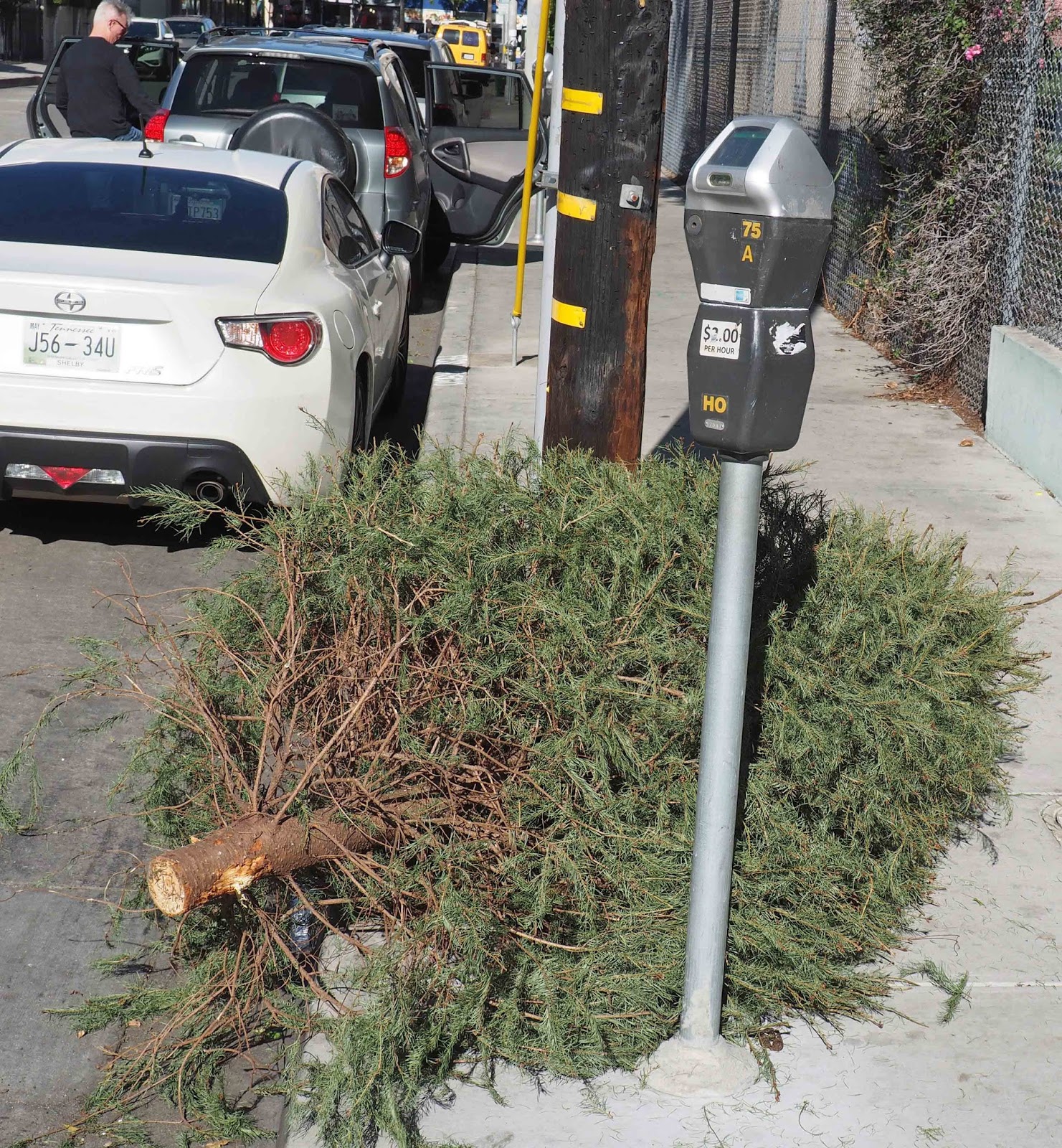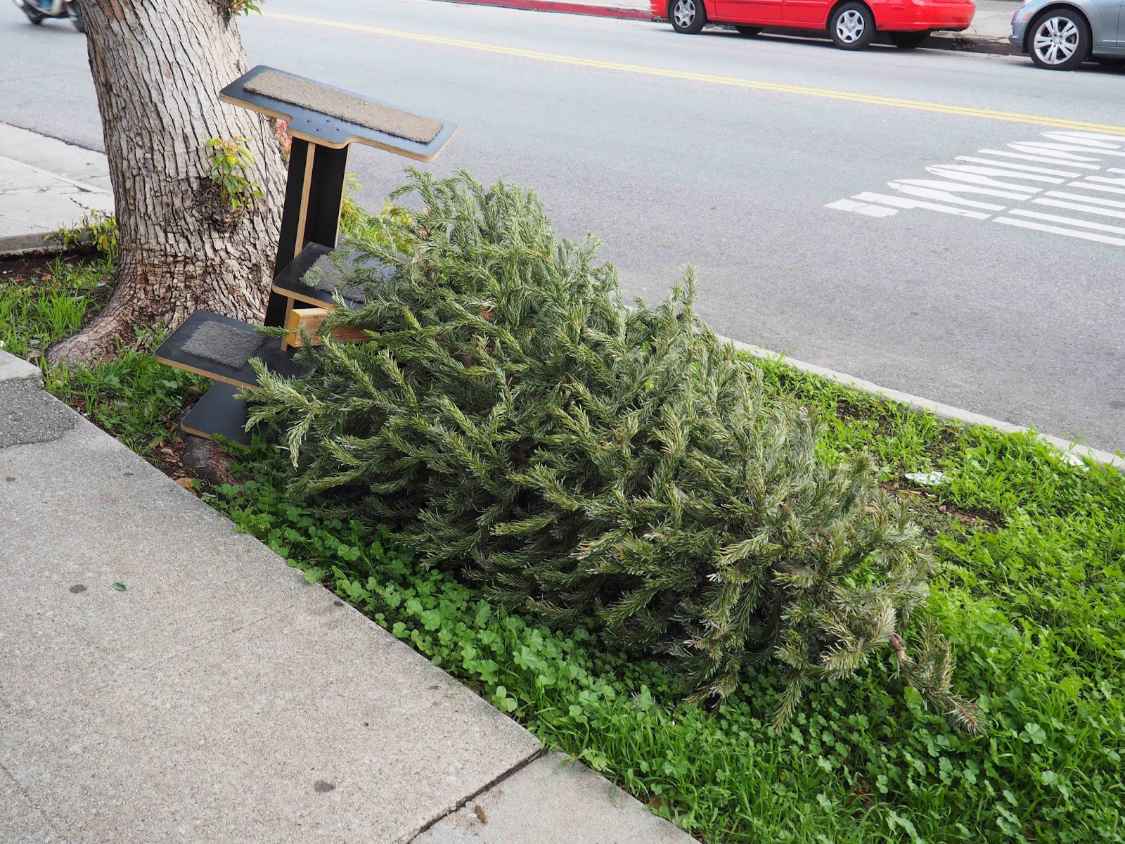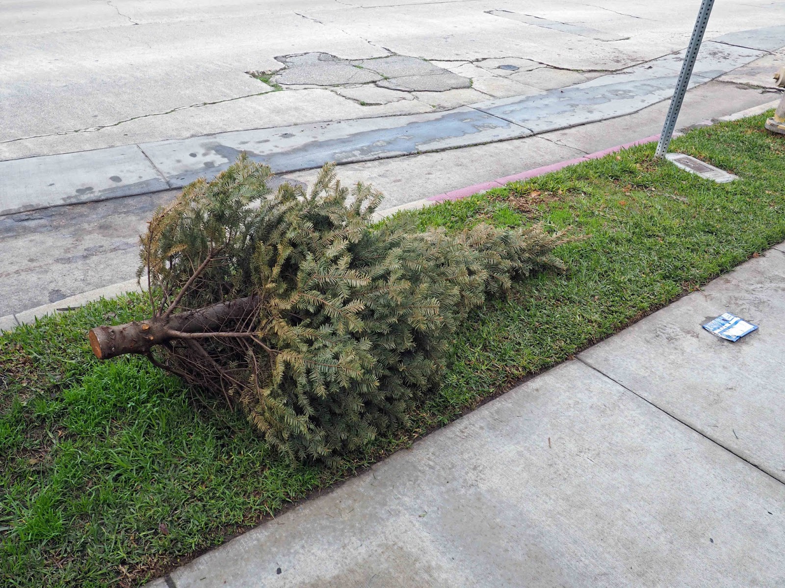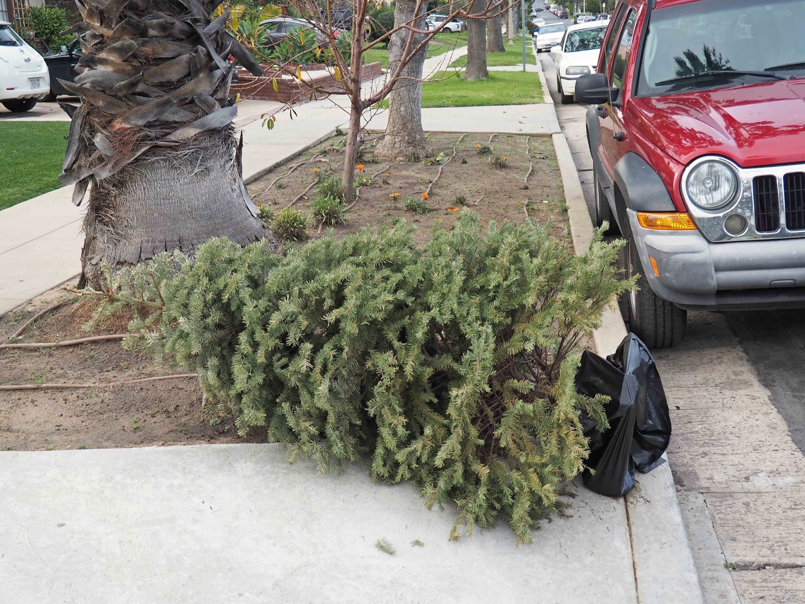 But why do people just leave them out on the street? I can see that the same question could be asked about old TVs and armchairs, but you can’t easily get a TV or an armchair into the average garbage can, whereas the ubiquitous green recycling bins of LA, could accommodate most domestic Christmas trees without much of a problem.