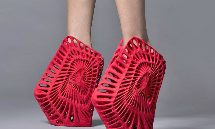 Zaha Hadid did design shoes (3D printing was involved in many of them), and it’s true that they don’t have high heels in the usual sense of the word, though it’s hard to imagine anybody actually walking very far in them.