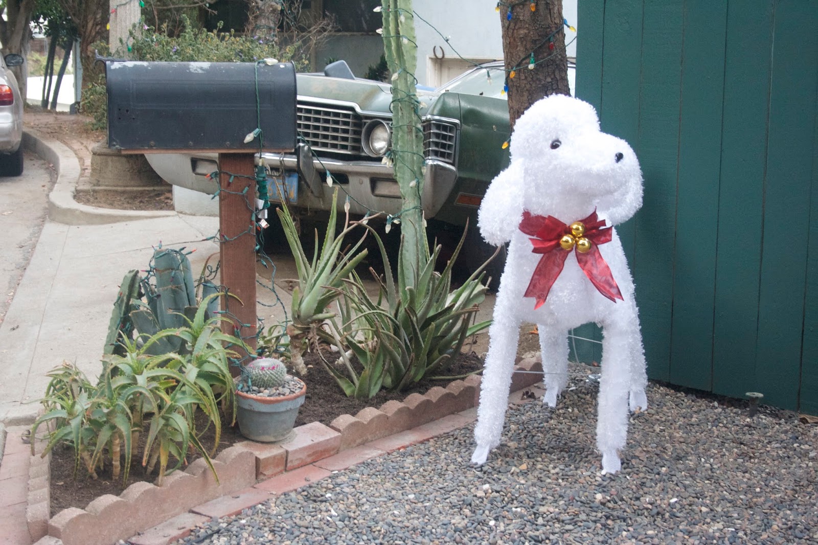 They’d painted the mailbox for one thing (maybe I noticed that because I know my own mailbox needs painting). Also they’d got some new and more plentiful Christmas lights. And some work had been done on the tiny patch of, for want of a better word, garden: goodbye to the agaves, hello to some things in pots that I can’t name.