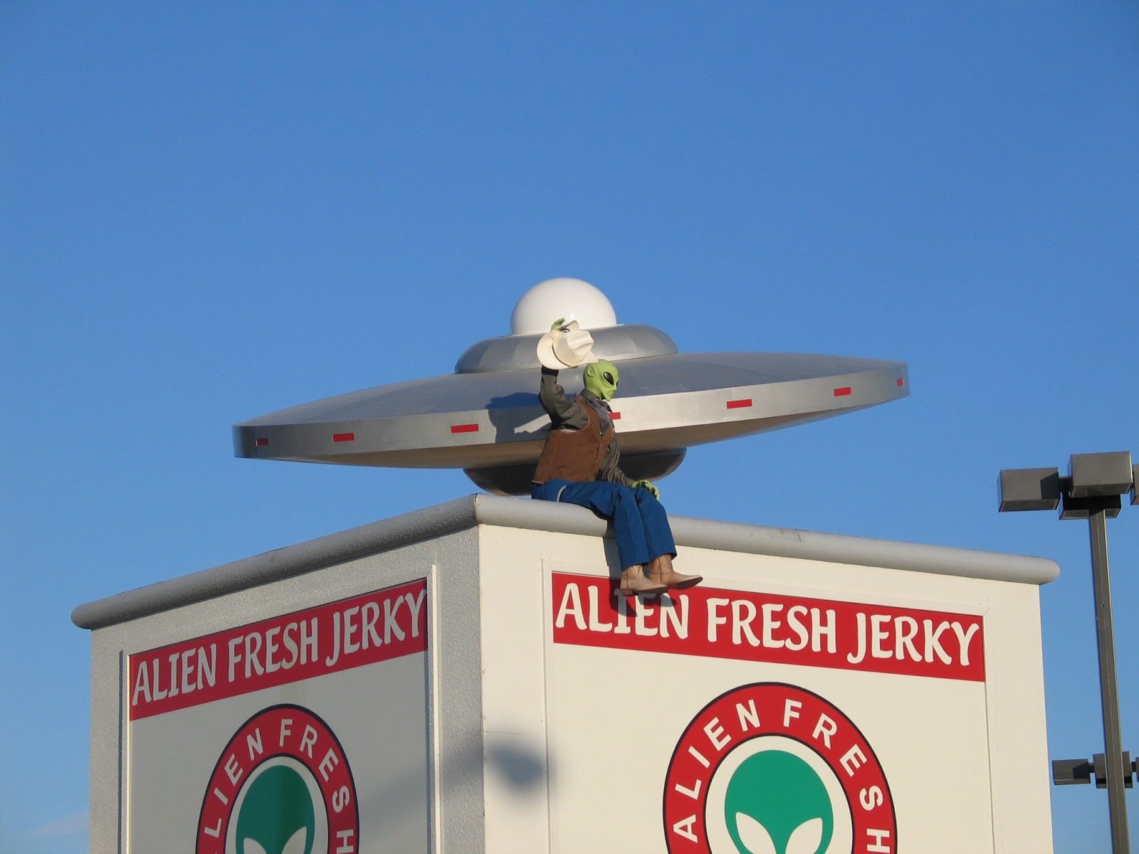 But not everything in Baker is in decline. There’s at least one optimist in town: Luis Ramallo, the owner of the Alien Jerky Store, which also specializes in hot sauce, candy, and space-age souvenirs. It’s been there for a little over a decade and business seems to be thriving. There used to be a very homemade-looking space alien and flying saucer on the roof. There’s now a full-size UFO parked outside, along with a row of movie-prop-quality aliens holding up metallic sunshades.