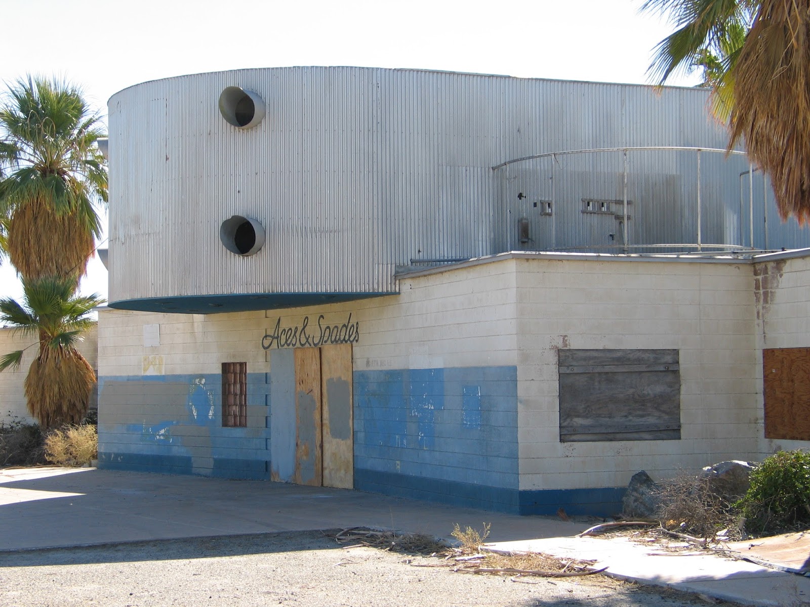 For a good while after it closed down, Arne’s remained more or less intact, but that’s changed. When I stopped in Baker recently it seemed that every piece of glass in the place had been smashed, doors broken down, and the whole place thoroughly vandalized, including the empty JG Ballard–style swimming pool out back, although the paneled ceiling was still there, looking great, waiting either for architectural salvagers or more determined vandals.