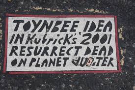 And then Matthew Licht, now in Italy, but long an inhabitant of New York City, reminded me of something he used to see on the road surfaces of Manhattan in the 1990s (although they were in other places too – various parts of north and south America): The Toynbee Tiles, which looked like this, messages cut out of lino, and stuck to the road.