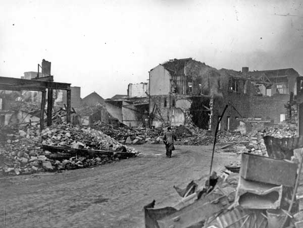 When it comes to photographing the aftermath of war, photographers are inevitably confronted by ruins: piles of rubble and masonry which in themselves may be rather unphotogenic. In those circumstances, what photographer can resist putting a walker or two in the picture?