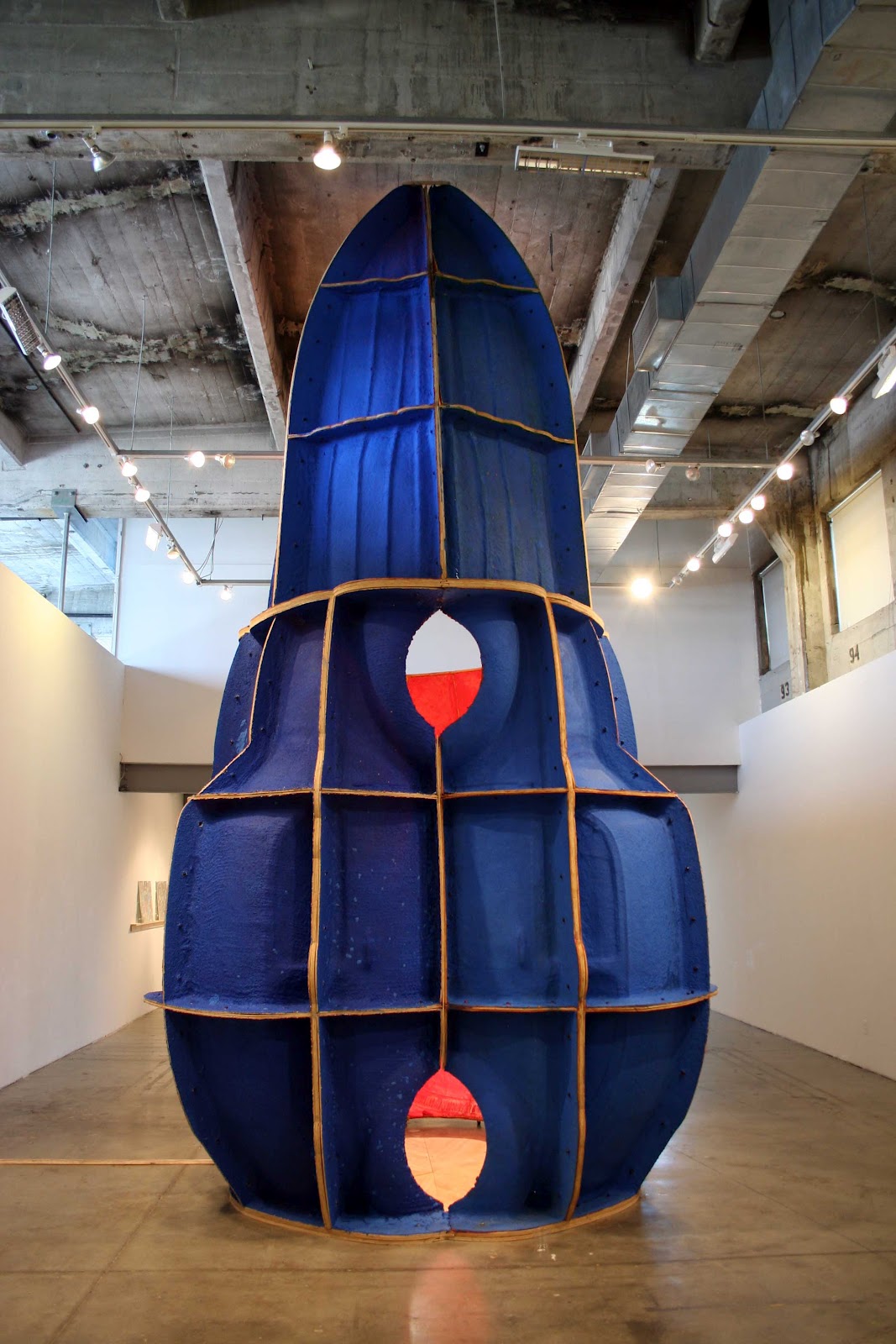 “Constructed from non-architectural artifacts, Yevrus 1, Negative Impression is a disposable architecture of literal references that calls into question the contemporary architectural vogue for digital complexity and abstraction. The cast impressions of 1973 Volkswagen Beetles and speedboats unite to form a strong structural whole that serves as a lookout tower in the SCI-Arc Gallery. "After studying a variety of objects within the Los Angeles suburban-scape, the designers selected the individual components for their iconic and structural potential, as well as their availability. Once chosen, the parts were digitally scanned in three dimensions and cast in biodegradable paper pulp using a proprietary technique the studio refers to as a "Yevrus"—the word "Survey" spelled backwards. With this work, the first in a series of experimental Yevrus projects, Ball-Nogues rethinks the purpose of the site survey. No longer seen as a simple tool for construction and engineering, the survey becomes an instrument for finding form, seeking structural stability and realizing iconic meaning.”