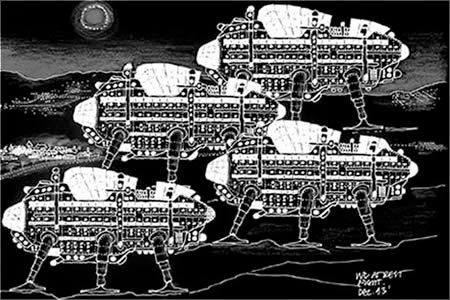 Herron’s idea, simultaneously quite absurd and utterly appealing, was of a city made up of separate structures, pods rather than what we think of as buildings, and these pods would have legs, and they could stroll around the world, or at least around whatever landmass they happened to be on, moving from one environment to another as conditions demanded, joining up with and separating from other similarly pods as they went, constantly forming and reforming themselves into fresh groupings and communities. This would probably have played havoc with the kids’ schooling, but after all this was only speculative.