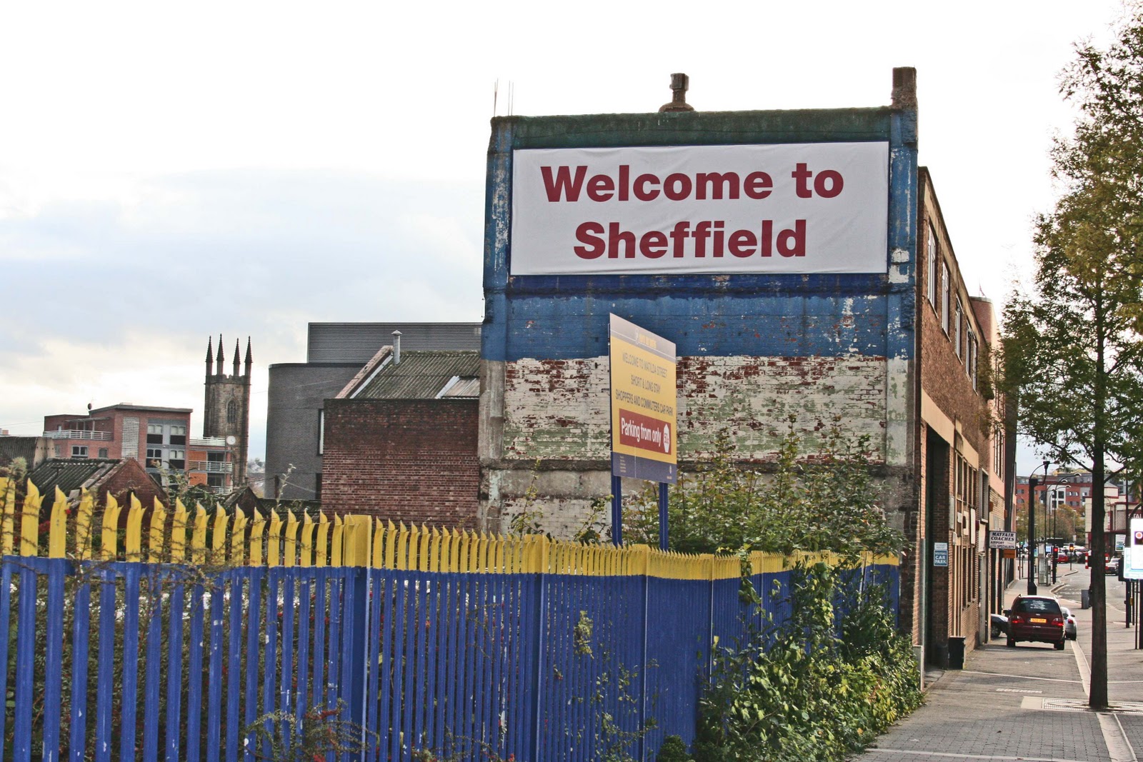 I did manage to find a Sheffield equivalent of the Hollywood Sign (well, sort of), a large banner hung on a wall beside a parking lot, saying "Welcome to Sheffield" though it seemed that whatever direction you were coming from, you'd have been in Sheffield for some time before you received this welcome.