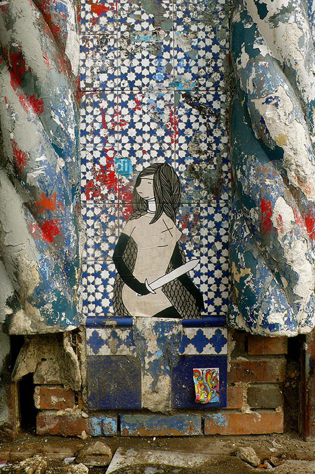 Sheffield seemed to be in the middle of a street art revival, as I suppose is much of the world. L.A. is currently awash with the stuff, both in and out of museums. In Sheffield the most ubiquitous was Kid Acne. Great name. His word pieces are all over the city, simple messages painted on the boards surrounding empty plots of land: "That'll Learn 'em," "Dust In the Giant's Eye," "Tha Knows," "You'll Get What You're Given," and so on. He was also having a show in the Millenium Galleries: I was particularly taken with his "stabby women."