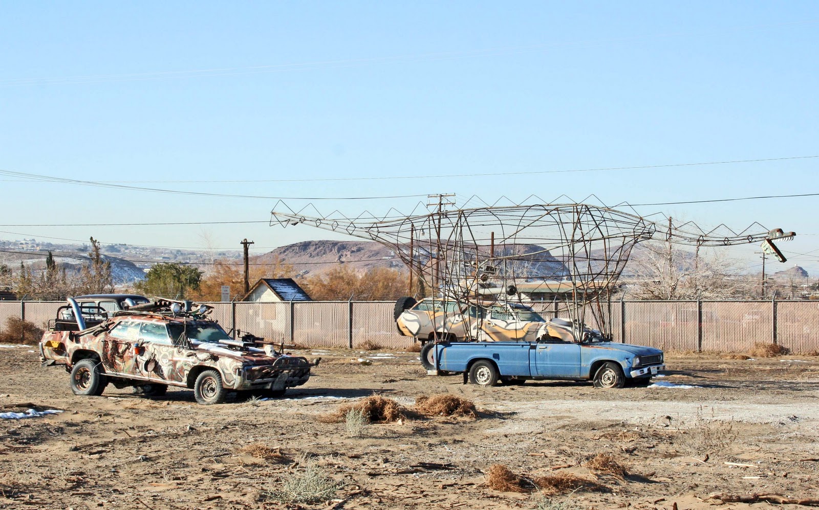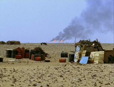 If I have a reservation about Gus Van Sant's "Gerry," (discussed elsewhere on this blog) it's that he, or his cinematographer, makes the desert look a little too picturesque. Of course, I'm not going to deny that the desert is visually beautiful, that's what first attracted me to it, and of course I love a broad stretch of unspoiled, pristine desert as much as the next man, and I'm very glad indeed that Death Valley or Joshua Tree survive as preserved patches of territory that are as close to "virgin" as we're ever likely to see, and of course they are meticulously "managed.". But the fact is, I also love a spoiled, less than pristine stretch of desert.