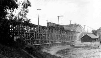 A website called http://redcarproperty.blogspot.com/ has pictures of the Red Car line, including the viaduct (above), but it takes a pretty enormous feat of the imagination to picture exactly how this fits with the current topography. As you see, at the time I was there someone was using the footings as bases for art works.