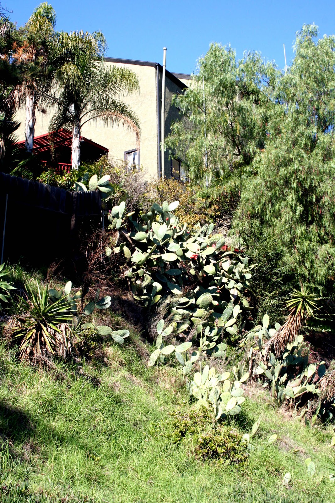 Initially the route runs alongside a chain link fence above the freeway, then widens out into open land, a desire line running across the middle, before narrowing again, and remaining unpaved as it takes you between people's houses and back yards. This land isn't public, and it certainly doesn't belong to the properties that line it, but as is the human way, the locals have spread themselves, encroached, extended their gardens, parked multiple cars and trucks on the land. Someone seems to have made a shrine to a dead pet, at least one hopes it's a pet. And nature has played is part too: there are escapee yuccas and cacti cascading down the hillsides.