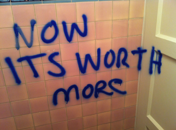 During the street art exhibition Deitch got into further trouble because he painted over a mural he'd commissioned for the side wall of the gallery, from the artist Blu. The art was too "political" apparently. A supporter of Blu claimed to have been at a party in Deitch's house, and painted this on the bathroom wall: