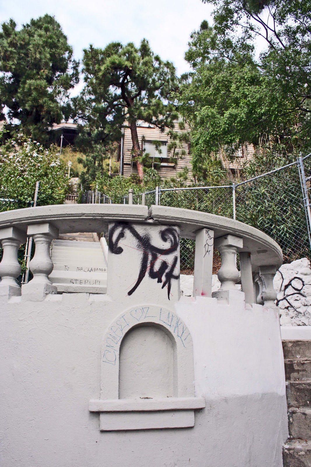 It's at the top of a flight of 150 steps, the kind you get in some parts of LA, here officially named Saint Andrews Walk (no apostrophe as far as I can tell). This is a pretty swank part of the neighborhood, far swankier than the part I live in. Across from the steps is a vast, much crenelated house that used to belong to Nicolas Cage.
