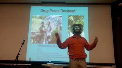 This, for me, is the key TOO HIGH TO FAIL photo that shows that Drug Peace has been declared in northern California: what you’re seeing is Mendocino County law enforcement officer Randy Johnson and sustainable locavore cannabis farmer Tomas Balogh at a farm inspection. It’s also reminder that despite my waltzing into the victory parade behind millions of drum masters, every cannabis farmer who spoke to me with his or her real name in TOO HIGH TO FAIL is still a civil disobedient, as are patients who use credit cards for their medicine. Nearly 800,000 Americans were arrested for cannabis last year. Let’s end this nonsense once and for all: tell your congressperson to remove cannabis from the Controlled Substances Act and let states regulate like alcohol.