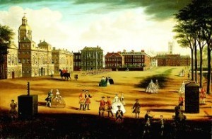 Just around the corner we have Number 10 Downing Street, residence of the Prime Minister and centre of government. It was quite a shock to me to hear that Downing Street was quite literally built on sand by a dodgy property speculator called George Downing. Downing had been a spy for Oliver Cromwell and later for Charles II. Between 1682 and 1684 he built a cul-de-sac of two storey townhouses intended for "persons of good quality," with coach-houses, stables and views of St James's Park. An advertisement in 1720, described Downing Street as: "… a pretty open Place, especially at the upper end, where are four or five very large and well-built Houses, fit for Persons of Honour and Quality; each House having a pleasant Prospect into St. James's Park, with a Tarras Walk." Three houses eventually combined to make Number 10 Downing Street – one of the townhouses, a cottage next door and a mansion called "The House at the Back" (love that name!) The House at the Back had been built at around the same date as Whitehall Palace and was occupied by royalty from time to time. There is a rather nice Ashdown House connection here – Elizabeth, daughter of James I, later the Winter Queen, had the House at the Back as her London residence from 1604 to 1613.