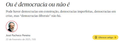 1. Não acompanho esta tese de J. Pacheco Pereira, nesta coluna no Público, segundo a qual a noção de "democracia iliberal" não faz sentido, porque, no seu entender, as democracias, ou são liberais ou não são democracias.