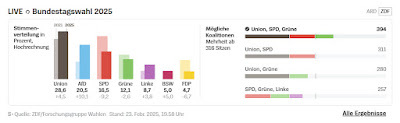 Mas, além da enorme derrota do SPD, não deixa de ser preocupante o crescimento das forças políticas radicais, antieuropeístas, tanto à direita (AfD, > 20%, duplicação do resultado das eleições anteriores) como à esquerda (Linke+BSW, ~14%, quase o triplo). Ou seja, 1 em cada 3 alemães votou em partidos hostis à democracia liberal e à UE.