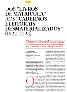 Embora não tenha sido assinalada aqui a sua publicação na altura, cabe informar que está agora disponível online o penúltimo texto da minha parceria autoral com o meu colega da Universidade Lusíada/Porto, José Domingues, publicado no nº de agosto passado da História JN, que traça o percurso do recenseamento eleitoral em Portugal - ou seja, o registo prévio dos cidadãos eleitores (e, por vezes, dos elegíveis) em cada circunscrição eleitoral -, desde a sua instituição nas eleições parlamentares de 1822, ao abrigo da nossa primeira Constituição, desse mesmo ano, até ao recenseamento eleitoral eletrónico e automático atualmente vigente.