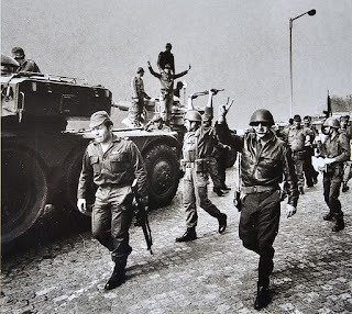 Para mim, mais do que as famosas imagens do Largo do Carmo, mais tarde, a foto mais icónica da Revolução é esta de Eduardo Gageiro, ainda manhã cedo no Terreiro do Paço, quando a coluna de Salgueiro Maia (à esquerda), vinda de Santarém, festeja a desistência de uma força adversária enviada para os combater. Mais tarde, Maia comentará esta foto do seguinte modo (cito de cor): «estava a morder os lábios para não chorar; senti que aquele episódio anunciava a vitória do movimento».