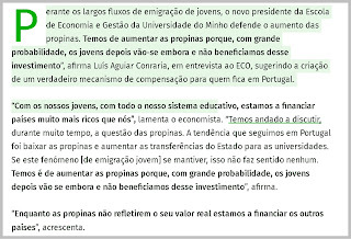 1. Estou inteiramente de acordo com esta opinião do Prof. Luís Aguiar-Conraria, que vem acrescentar um valioso argumento a favor do aumento das propinas no ensino superior.Sempre fui a favor das propinas no ensino superior - que não é um serviço público universal como o ensino básico e secundário -, ao abrigo do princípio beneficiário-pagador, uma vez que o ensino superior é antes de mais um investimento dos estudantes no seu próprio futuro profissional, devendo portanto ser financiado pelos próprios, e não por transferências orçamentais, à custa dos impostos de todos (ressalvadas as "externalidades positivas" para a sociedade).2. No entanto, contra esta boa doutrina, nos últimos governos do PS, por pressão do PCP e do BE, verificou-se uma substancial redução das propinas - a que naturalmente me opus -, aumentando a dependência das IES das transferências orçamentais, pondo em causa a sua autonomia, que é tanto menor quanto menor for a sua autossustentabilidade financeira.