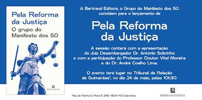 Depois do lançamento em Lisboa e no Porto, eis mais uma sessão de apresentação pública das ideias do «Manifesto dos 50 pela Reforma da Justiça» e do livro entretanto publicado, desta vez em Guimarães, no Tribunal da Relação, numa iniciativa do Professor António Cândido de Oliveira e do Dr. André Coelho Lima, ambos subscritores do Manifesto, a que tenho a oportunidade e o gosto em me associar.